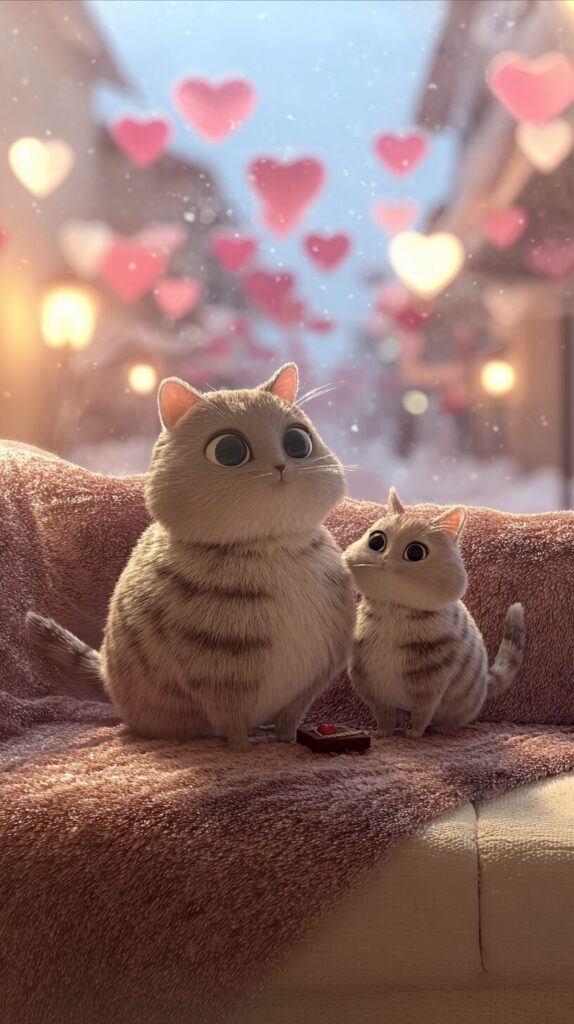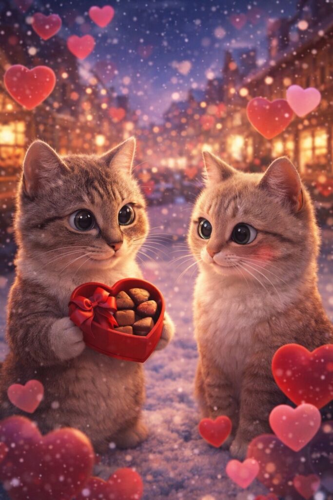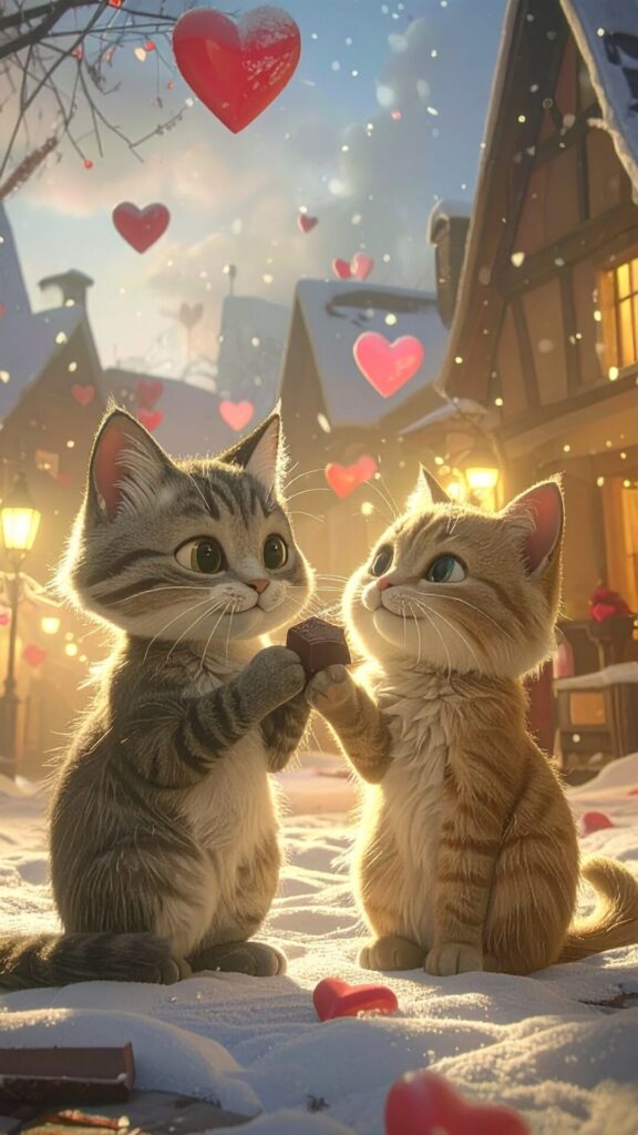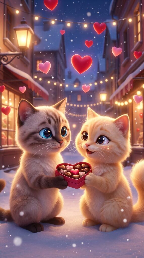 Cute male and female cat characters, February Valentine’s Day theme, romantic town filled with floating red and pink hearts, gentle snowfall in winter evening, male cat offering chocolate to female cat, fluffy fur, big sparkling eyes, cinematic slow motion, soft bokeh, warm illuminations, dreamy lighting, 3D animation style, Pixar-inspired character design, ultra detailed, 8K, cinematic lighting, emotional and sweet atmosphere, short movie prompt